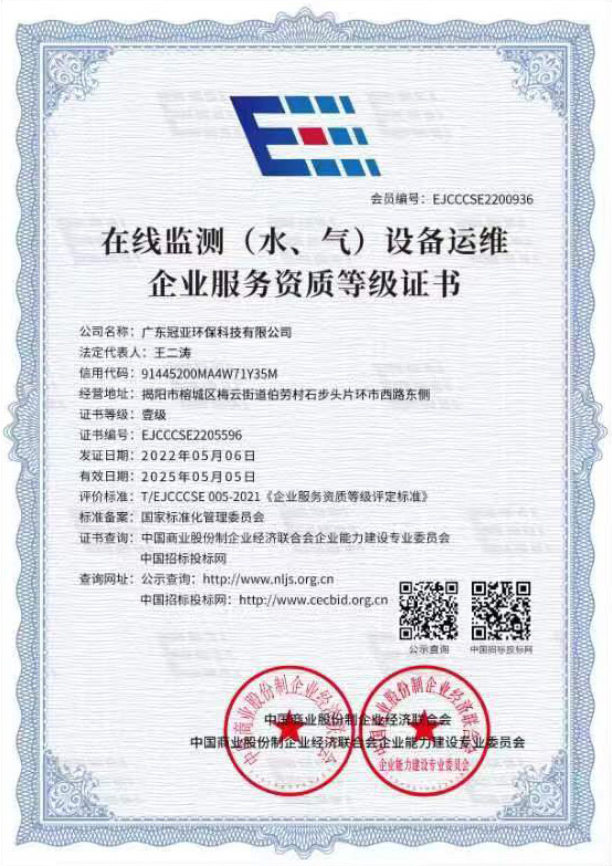 在線監測(水、氣)設備運維企業服務資質等級證書