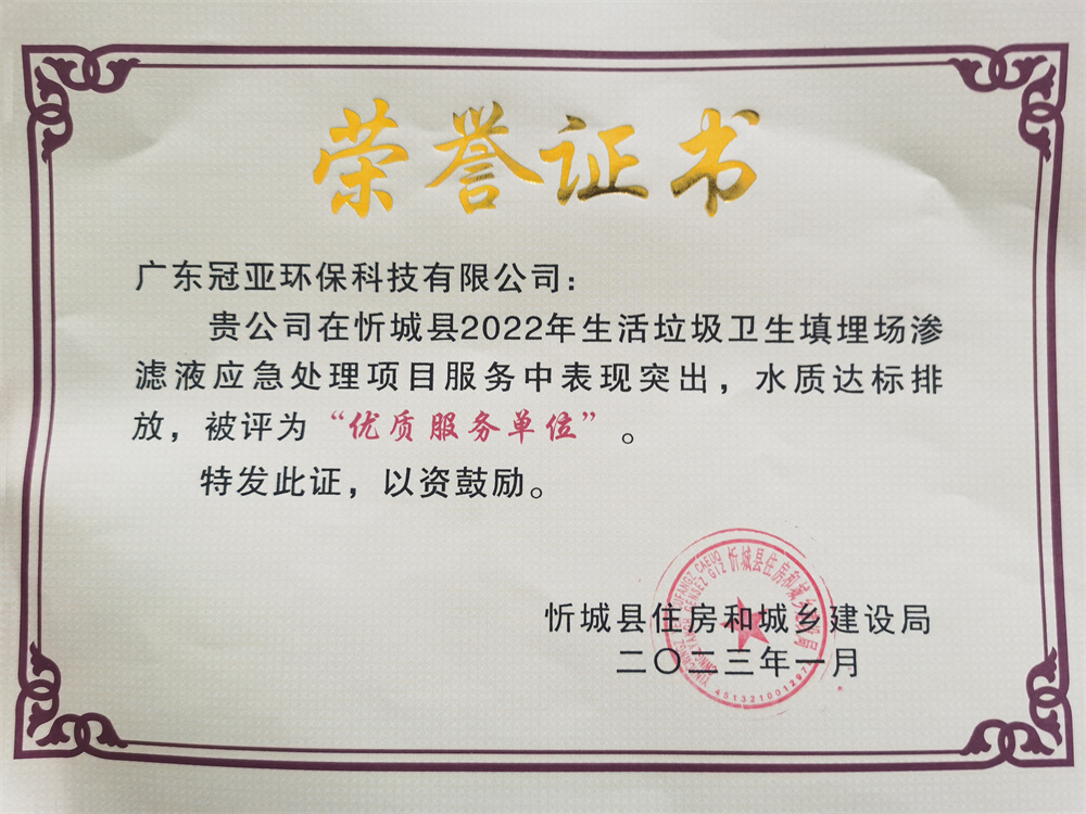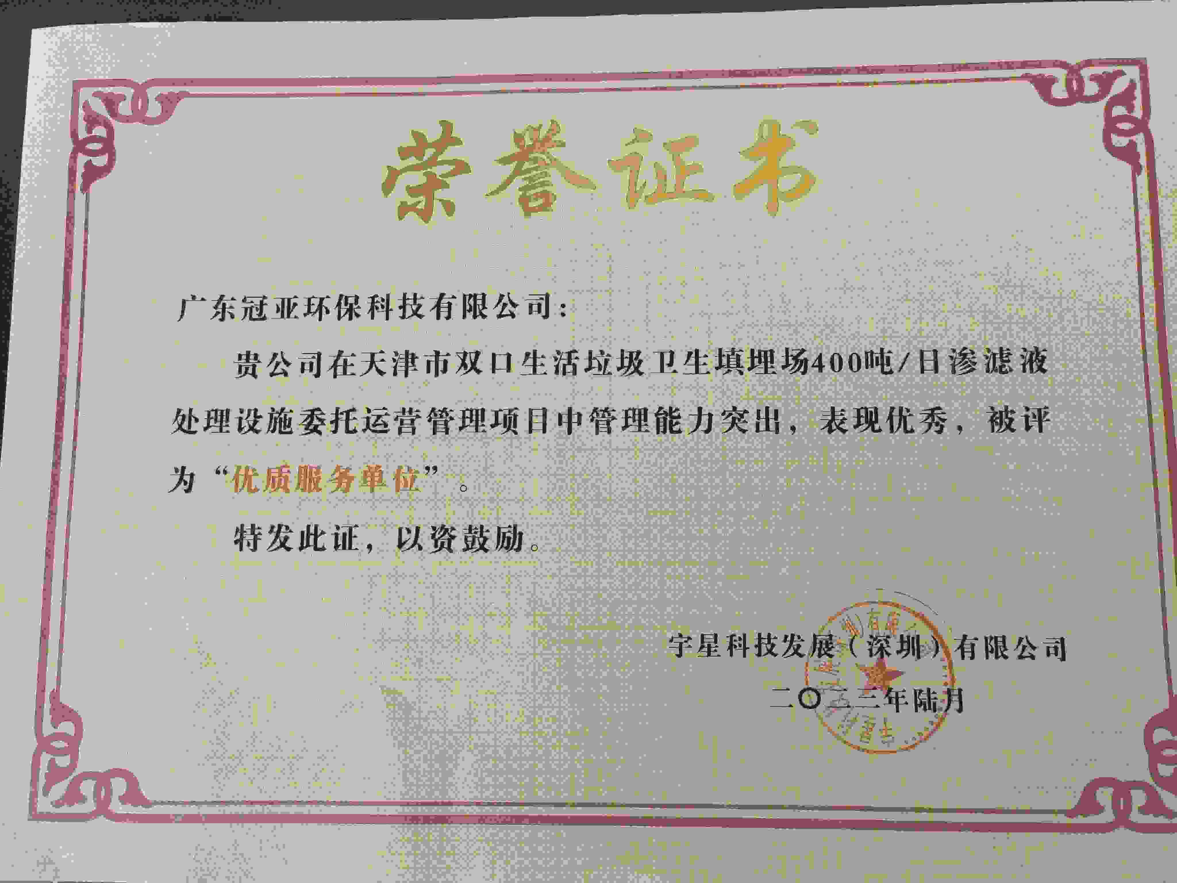 冠亞環保-天津站點榮獲優質服務單位稱號