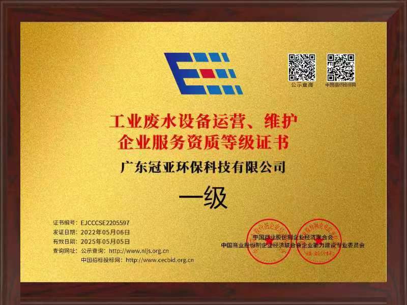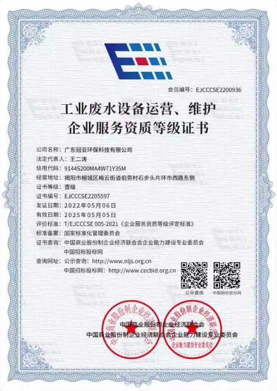 工業廢水設備運營、維護企業服務資質等級證書