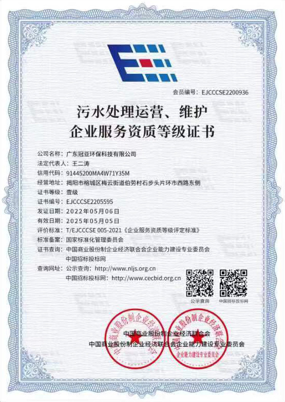 污水處理運營、維護企業服務資質等級證書