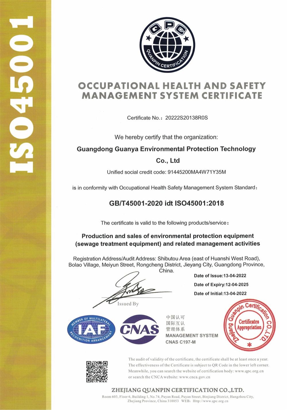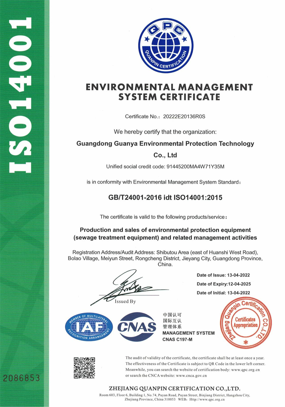 環境管理體系認證證書